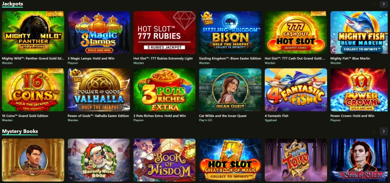 För spelare som uppskattar större vinstpotential har Betrix Casino Àven dedikerade hyllor som Jackpottar, dÀr du ser titlar som 3 Magic Lamps: Hold and Win (Playson), Hot Slot: 777 Rubies Extremely Light (Wazdan), Sizzling Kingdom: Bison Easter Edition (Wazdan), 16 Coins Grand Gold Edition (Wazdan), och 3 Pots Riches Extra: Hold and Win (Playson).